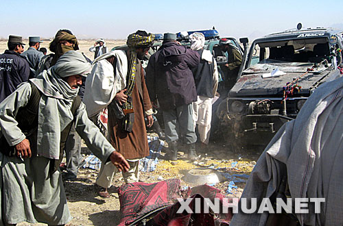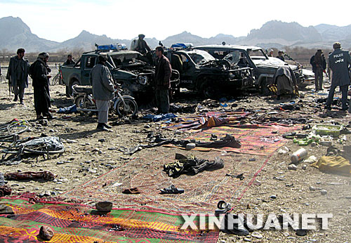 2月17日,警察和路人在阿富汗南部坎大哈市的爆炸襲擊現場查看。新華社/法新