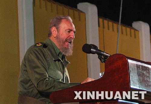 2008年2月19日,正在術后康復中的古巴領導人菲德爾·卡斯特羅宣布,他將“不尋求也不接受”國務委員會主席和革命武裝部隊總司令這兩個職務。圖為2003年7月26日晚,卡斯特羅在圣地亞哥東北部蒙卡達兵營舊址舉行的集會上發表講話。 新華社記者趙凱攝
