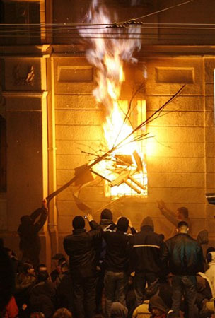 塞爾維亞抗議者襲擊美國使館。(圖片轉自:中國網) |