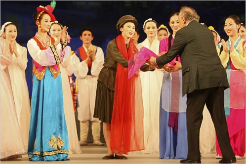 美國紐約愛樂樂團(tuán)音樂總監(jiān)兼指揮馬澤爾與朝鮮演出人員在一起。