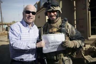 正在伊拉克訪問的麥凱恩與保護(hù)他的駐伊美軍少校合影。