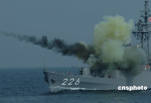日本海上自衛隊2006年十月二十九日在東京附近的相模灣海面舉行閱兵儀式。圖為相關艦艇演示發射反潛火箭彈。 中新社發 王健 攝