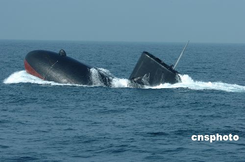 圖為參加閱兵的二千噸級潛水艇演示緊急上浮。 中新社發 王健 攝