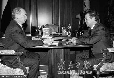 據俄國媒體報道,會前,普京走向了桌子左側的“總統寶座”,然而他沒有馬上坐下,而是對身邊的新任總統梅德韋杰夫說道:“現在是你的座位了。”梅德韋杰夫答道:“有什么區別嗎?”隨后馬上坐在桌子右側的座位上,這個座位一直是普京八年任期中客人的座位。