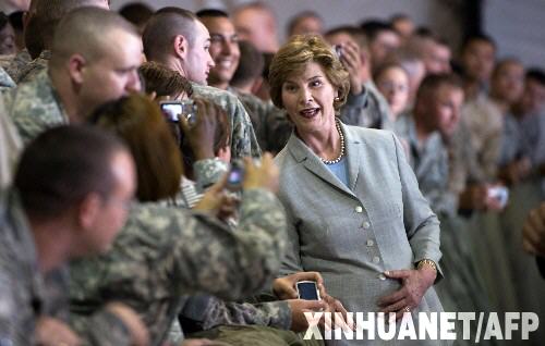 6月8日,在阿富汗巴格拉姆美軍基地,美國(guó)第一夫人勞拉·布什(中)與美軍士兵見面。布什夫人當(dāng)日突訪阿富汗,呼吁國(guó)際社會(huì)不要放棄這個(gè)飽受戰(zhàn)爭(zhēng)、暴力摧殘的國(guó)家。 新華社/法新