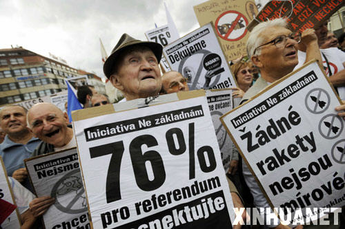 7月8日,數百名反對者在捷克首都布拉格市中心舉行抗議活動,反對美國在捷克境內建立反導雷達基地。 新華社/捷通社