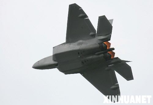 7月14日,在英國(guó)小鎮(zhèn)法恩伯勒舉行的國(guó)際航展上,美軍F22戰(zhàn)斗機(jī)進(jìn)行飛行表演。當(dāng)天,英國(guó)2008法恩伯勒國(guó)際航空展(又譯范堡羅航空展)拉開帷幕,航展將持續(xù)到20日,包括當(dāng)今世界最大的民航客機(jī)——空中客車A380在內(nèi)的最新民用和軍用飛機(jī)以及其它航空科技成果將在這里展出。新華社記者謝秀棟攝