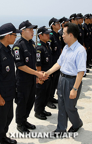 7月29日,韓國總理韓升洙在獨島(日本稱“竹島”)上慰問執行任務的警務人員。 新華社/法新