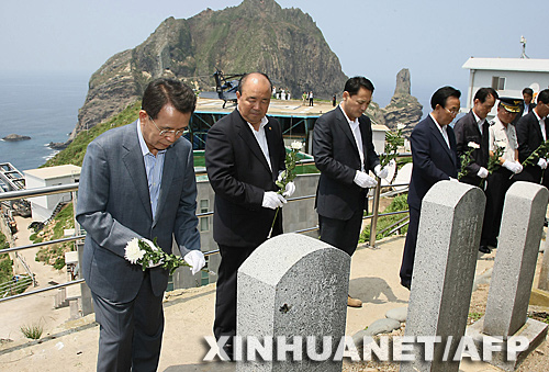 7月29日,韓國總理韓升洙(左一)和隨行人員在獨島(日本稱“竹島”)上的墓碑前默哀。新華社/法新