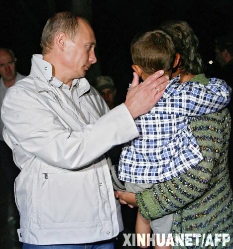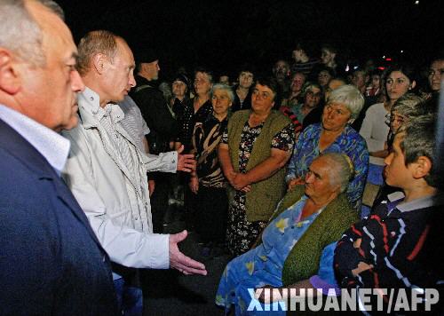 8月9日,在俄羅斯北奧塞梯共和國首府弗拉季高加索,俄總理普京(左一)與逃離格魯吉亞南奧塞梯的難民交談。 新華社/法新