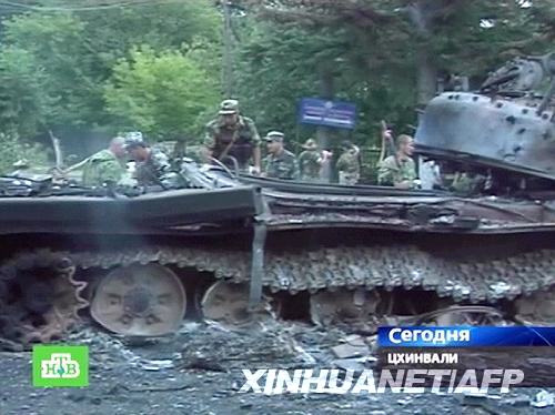 電視畫面顯示的是8月9日,在格魯吉亞南奧塞梯首府茨欣瓦利,一些南奧塞梯自治州武裝人員爬上一輛被毀的格魯吉亞坦克。據俄塔社報道,格魯吉亞總統薩卡什維利9日說,由于“俄羅斯侵略格魯吉亞”,他決定簽署命令宣布國家進入“戰時狀態”。圖片來源:新華社/法新