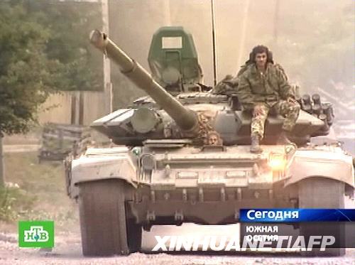 電視畫面顯示的是8月9日,俄羅斯士兵駕駛坦克在格魯吉亞南奧塞梯首府茨欣瓦利附近行進。據俄塔社報道,格魯吉亞總統薩卡什維利9日說,由于“俄羅斯侵略格魯吉亞”,他決定簽署命令宣布國家進入“戰時狀態”。圖片來源:新華社/法新
