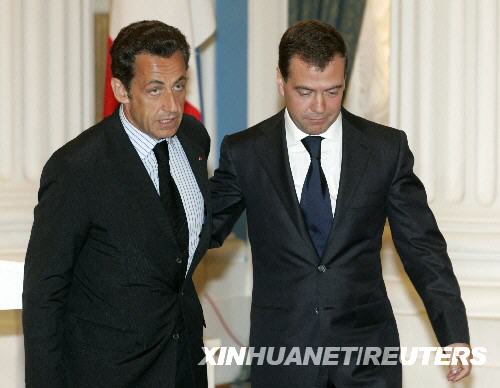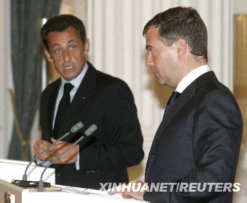8月12日,俄羅斯總統(tǒng)梅德韋杰夫(右)同法國總統(tǒng)薩科齊在莫斯科出席聯(lián)合新聞發(fā)布會。梅德韋杰夫當(dāng)天與到訪的法國總統(tǒng)薩科齊就解決南奧塞梯沖突達(dá)成包括“放棄使用武力”在內(nèi)的六項(xiàng)原則。梅德韋杰夫說,兩國總統(tǒng)支持將六項(xiàng)原則作為解決南奧塞梯沖突的基礎(chǔ)并呼吁各方接受這些原則。 新華社/路透