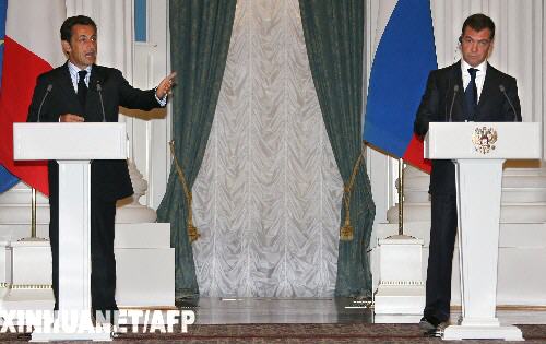 8月12日,俄羅斯總統(tǒng)梅德韋杰夫(右)同法國總統(tǒng)薩科齊在莫斯科出席聯(lián)合新聞發(fā)布會。梅德韋杰夫當(dāng)天與到訪的法國總統(tǒng)薩科齊就解決南奧塞梯沖突達(dá)成包括“放棄使用武力”在內(nèi)的六項(xiàng)原則。梅德韋杰夫說,兩國總統(tǒng)支持將六項(xiàng)原則作為解決南奧塞梯沖突的基礎(chǔ)并呼吁各方接受這些原則。 新華社/法新 |