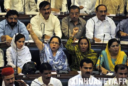 8月13日,巴基斯坦信德省的議員們在首府卡拉奇參加一次議會會議時高呼反對總統(tǒng)穆沙拉夫的口號。信德省議會當(dāng)日通過一項議案,要求總統(tǒng)穆沙拉夫?qū)で笮湃瓮镀薄_@是繼旁遮普省議會、西北邊境省議會之后第三個通過類似議案的省議會。 圖片來源:新華社/法新