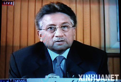 這張8月18日攝自巴基斯坦國家電視臺的電視照片顯示,巴基斯坦總統(tǒng)穆沙拉夫向全國發(fā)表電視講話宣布辭職。 新華社發(fā)
