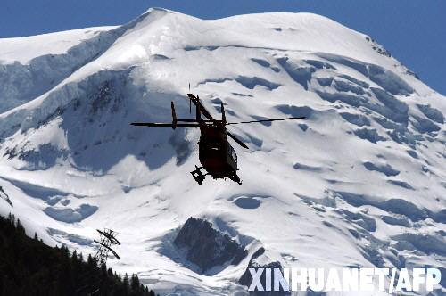 8月24日,一架救援直升機在法國沙莫尼山谷搜救雪崩中失蹤的登山者。歐洲最高峰勃朗峰在當日凌晨發生雪崩,目前造成至少8人受傷,10人下落不明。 新華社/法新