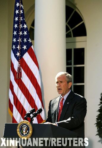 10月3日,美國總統(tǒng)布什在首都華盛頓就美國國會眾議院通過經(jīng)過修改的大規(guī)模金融救援方案發(fā)表講話。當天,這份總額達7000億美元的金融救援方案由布什簽署生效。 新華社/路透
