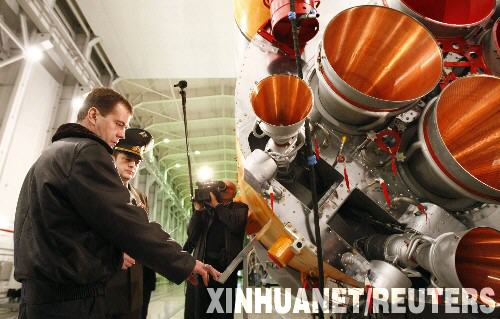 10月11日,俄羅斯總統(tǒng)梅德韋杰夫(左一)參觀普列謝茨克發(fā)射場(chǎng)。俄羅斯戰(zhàn)略火箭兵12日從普列謝茨克發(fā)射場(chǎng)成功試射一枚“白楊”RS-12M型洲際導(dǎo)彈,導(dǎo)彈準(zhǔn)確命中遠(yuǎn)東堪察加半島的目標(biāo)。俄羅斯總統(tǒng)梅德韋杰夫觀摩了導(dǎo)彈發(fā)射。 新華社/路透 |