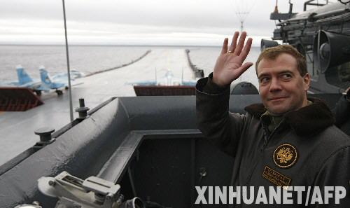 10月11日,俄羅斯總統(tǒng)梅德韋杰夫在巴倫支海海域觀摩俄海軍北方艦隊(duì)軍事演習(xí)時(shí)揮手致意。梅德韋杰夫當(dāng)日在巴倫支海海域觀摩了正在進(jìn)行的代號(hào)為“德維納”的俄海軍北方艦隊(duì)軍事演習(xí),演習(xí)中一艘核潛艇成功試射了一枚洲際彈道導(dǎo)彈。 新華社/法新
