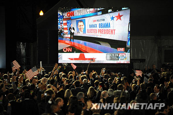 11月4日,在美國芝加哥格蘭特公園,美國民主黨總統候選人、伊利諾伊州國會參議員貝拉克·奧巴馬的支持者歡呼慶祝。新華社/法新