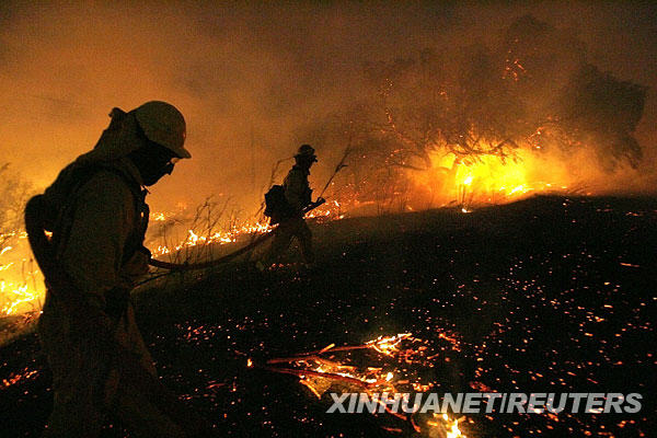 11月16日,在美國加利福尼亞州布雷亞,消防員試圖控制火勢。連日來,美國加州南部山林大火席卷洛杉磯及鄰近地區,燒毀800多處住宅,數萬人被迫疏散。 新華社/路透