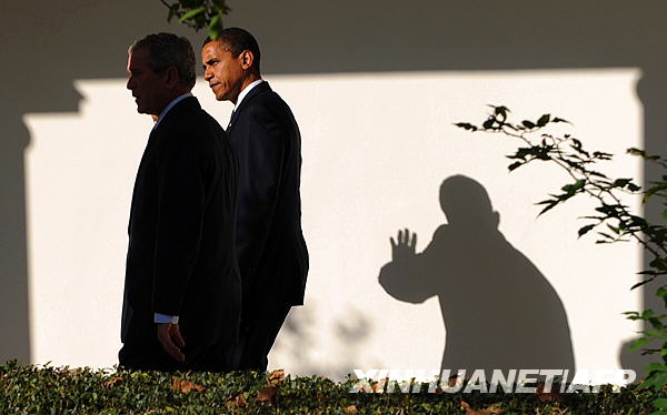 11月10日,美國當(dāng)選總統(tǒng)奧巴馬(右)應(yīng)邀進入白宮會見現(xiàn)任總統(tǒng)布什,就經(jīng)濟危機和伊拉克戰(zhàn)爭等問題舉行會談,以確保政府順利過渡。新華社/法新