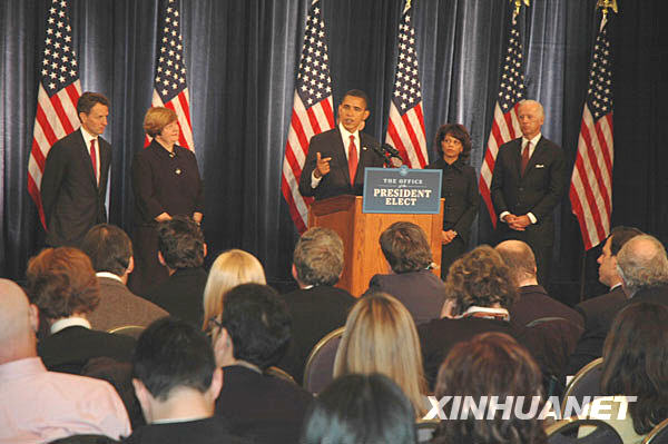 11月24日,美國當(dāng)選總統(tǒng)奧巴馬(中)在芝加哥舉行的新聞發(fā)布會(huì)上發(fā)表講話。奧巴馬當(dāng)天召開新聞發(fā)布會(huì),正式提名新政府經(jīng)濟(jì)團(tuán)隊(duì)主要成員,其中包括財(cái)政部長、國家經(jīng)濟(jì)委員會(huì)主任和白宮經(jīng)濟(jì)顧問委員會(huì)主任等人選。 新華社記者 韓萬寧攝