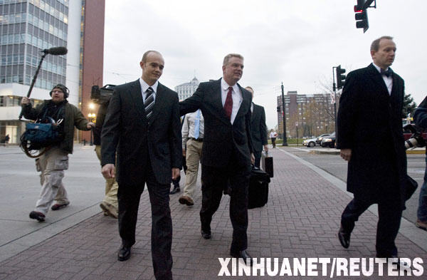 12月8日,前美國“黑水”私人保安公司雇員尼克·斯萊特(中左)和他的律師托馬斯·康諾利(中右)到達猶他州鹽湖城地方法院。美國司法部當日說,因卷入去年伊拉克一起造成10多名平民死亡的槍擊事件,美國“黑水”私人保安公司5名雇員被控14項殺人罪名、20項殺人未遂罪名和一項濫用武器罪名。 新華社/路透