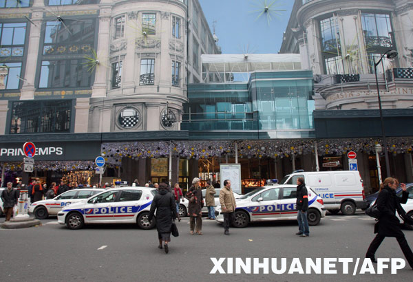 12月16日,數輛警車停靠在法國首都巴黎市中心的春天百貨商場前。新華社/法新