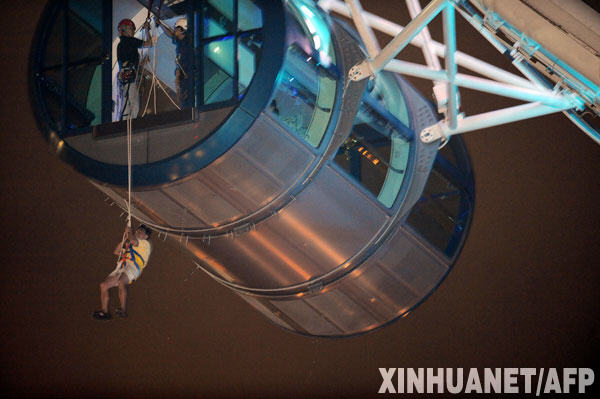 12月23日,工作人員用繩索轉移一名被困在新加坡摩天觀景輪座艙中的游客。 新華社/法新