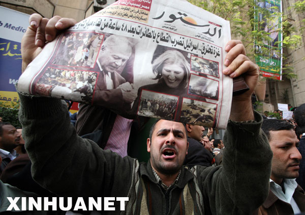 12月28日,埃及民眾在開羅舉行集會,抗議以色列空襲加沙地帶,聲援加沙民眾。以色列空軍27日開始對加沙地帶多處地點進行空襲,目前已造成至少271人死亡、900多人受傷,其中120人傷勢嚴重。新華社發(納賽爾攝)