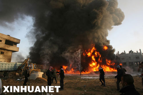 12月28日,加沙地帶南部拉法附近的儲(chǔ)油倉庫和藥品倉庫在以軍空襲中被擊中起火。新華社發(fā)