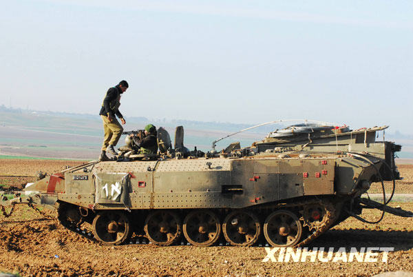 1月5日,在加沙北部邊境地區(qū),以色列士兵在裝甲車上警戒。當(dāng)日,以色列軍隊(duì)繼續(xù)地面進(jìn)攻加沙地帶,并已將加沙地帶分隔成南北兩塊區(qū)域。以軍發(fā)動(dòng)的“鑄鉛”軍事行動(dòng)目前已造成巴勒斯坦方面514人死亡,約2600人受傷。新華社發(fā)(拉菲爾攝)
