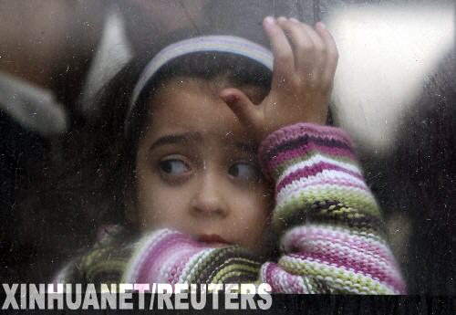 1月8日,一名準備離開加沙地帶以躲避戰火的巴勒斯坦兒童從大巴中向外張望。 新華社/路透
