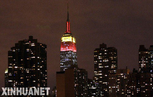 圖為2008年2月7日,紐約帝國大廈亮起象征喜慶吉祥的紅黃兩色彩燈,向華人和亞裔人士賀新春。當天晚上,帝國大廈總經理詹姆斯·康納斯和中國駐紐約總領事彭克玉出席了紐約帝國大廈的點燈儀式。 新華社記者劉宗亞攝