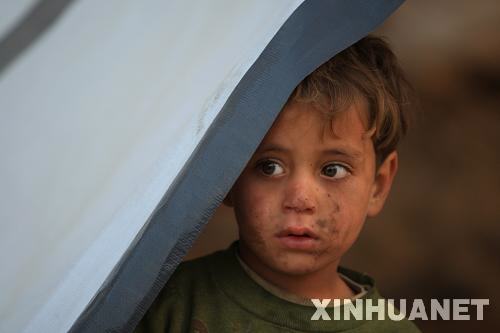 2月7日,在加沙城鎮拜特拉希耶,一名巴勒斯坦男孩躲在帳篷內向外望。當日,巴民族權力機構主席阿巴斯希望國際社會加快對加沙的人道主義援助和重建,解除對加沙的封鎖,開放口岸。新華社記者納賽爾攝