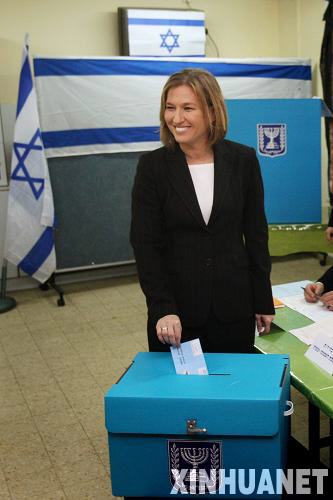 2月10日,以色列外長、前進黨主席利夫尼在特拉維夫的一個投票站投票。新華社發