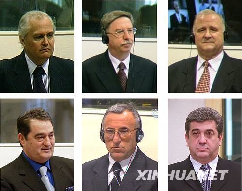 2月26日,設在荷蘭海牙的聯合國前南刑事法庭將在海牙對前南斯拉夫聯盟共和國塞爾維亞共和國總統米蘭·米盧蒂諾維奇等六名高級領導人做出一審判決。這是前南刑庭公布的六名受審者出庭時的資料照片,拼合照片中上排左至右為米盧蒂諾維奇、前南聯盟副總理沙伊諾維奇,前南聯盟軍隊總參謀長奧伊達尼奇,下排左至右為前南聯盟軍隊高級將領帕夫科維奇、扎拉雷維奇,前南聯盟警察高級將領盧基奇。 新華社發(前南刑庭提供)