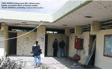 據(jù)以色列警方透露,其中1枚火箭彈擊中當(dāng)?shù)匾凰罩脤W(xué)校,毀掉數(shù)間教室,造成2人受傷、8人受到驚嚇,另外5枚火箭彈擊中無人地帶,沒有造成人員傷亡。