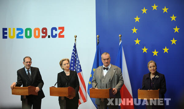 3月5日,在比利時首都布魯塞爾的歐盟總部,歐盟負責(zé)外交與安全事務(wù)的高級代表索拉納、到訪的美國國務(wù)卿希拉里·克林頓、歐盟輪值主席國捷克外長施瓦岑貝格和歐盟委員會負責(zé)對外關(guān)系和歐洲睦鄰政策的委員瓦爾德納(從左至右)共同會見記者。美國國務(wù)卿希拉里·克林頓當(dāng)天到訪歐盟,并將于當(dāng)晚在瑞士日內(nèi)瓦與俄羅斯外長拉夫羅夫舉行會談。新華社記者武巍攝