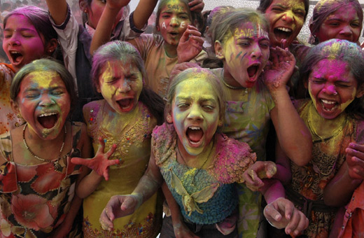 3月9日,印度加爾各答,人們?cè)跉g慶一年一度的傳統(tǒng)節(jié)日“Holi”節(jié),這個(gè)節(jié)日是印度最盛大的節(jié)日之一,源于古人期盼豐收的活動(dòng),在每年2月至3月間舉行。節(jié)日里最有趣的慶祝方式式就是涂抹色彩了,人們會(huì)用手或類(lèi)似水槍的工具把各種色彩的顏料涂在別人身上表示祝福,因此中文還把這個(gè)節(jié)日翻譯成灑紅節(jié)。