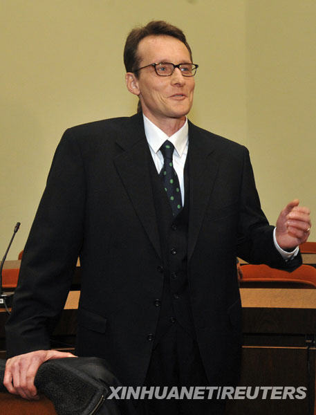 3月9日,瑞士男子黑爾格·斯加爾比(中)在律師的陪同下來到德國慕尼黑的法庭接受審判。新華社/路透