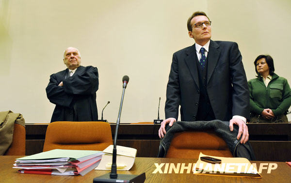 3月9日,瑞士男子黑爾格·斯加爾比(前)在德國慕尼黑的法庭等待開庭受審。新華社/法新