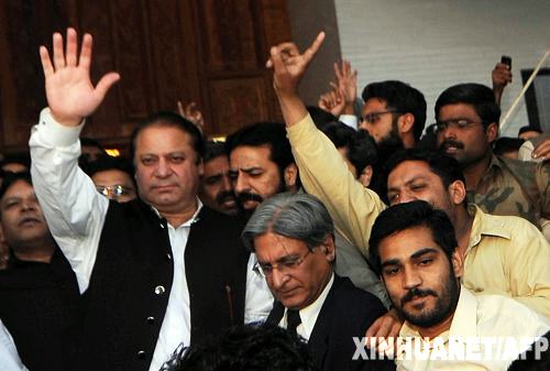 3月16日,巴基斯坦前總理、穆斯林聯(lián)盟(謝里夫派)領(lǐng)導(dǎo)人謝里夫(左)在東部旁遮普省的古杰蘭瓦拉市參加集會(huì)活動(dòng)。謝里夫在當(dāng)日的集會(huì)上說,鑒于政府已同意恢復(fù)被解職的最高法院首席大法官喬杜里的職務(wù),他宣布停止其領(lǐng)導(dǎo)的游行抗議活動(dòng)。 新華社/法新