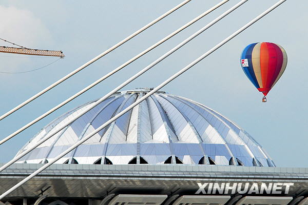 3月19日,一個熱氣球飛過普特拉賈亞一個正在建設的清真寺。新華社發(張紋綜攝)