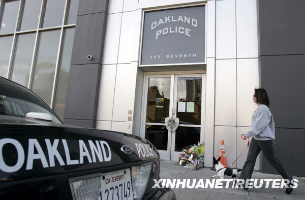 3月21日,在美國加利福尼亞州的奧克蘭市,一名婦女從警察局門前經過,警察局門口擺放著悼念殉職警察的鮮花。新華社/路透
