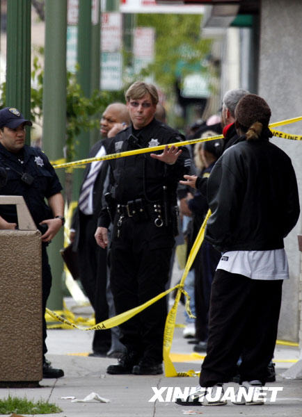 3月21日,在美國加利福尼亞州的奧克蘭市,當?shù)鼐煸跇寭衄F(xiàn)場詢問目擊者。新華社/美聯(lián)