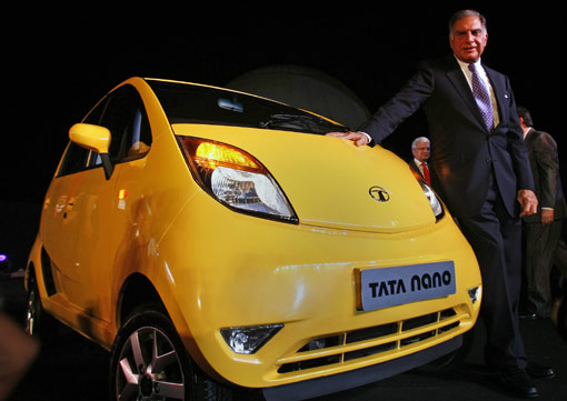 3月23日世界上最便宜的汽車——印度塔塔汽車公司生產的“塔塔Nano”在印度孟買的汽車展上正式亮相, “塔塔Nano”售價僅為2000美元,號稱全球價格最低的汽車。生產商塔塔公司主席拉坦·塔塔為NANO揭幕。中新網圖