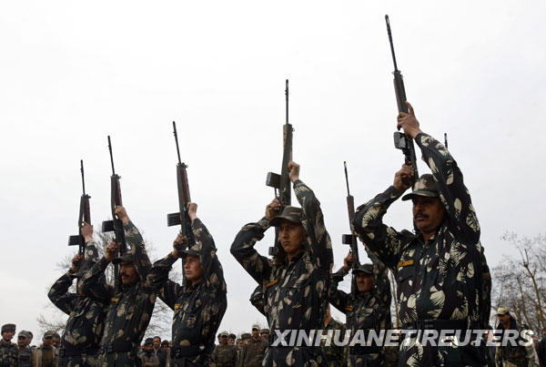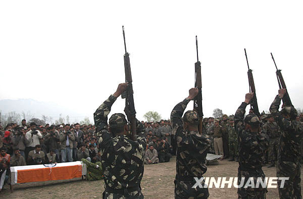 3月24日,在印控克什米爾首府斯利那加以北35公里處的達布,戰(zhàn)友們準備在印度士兵沙比爾·艾哈邁德·馬里克的葬禮上鳴槍。新華社/路透
